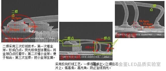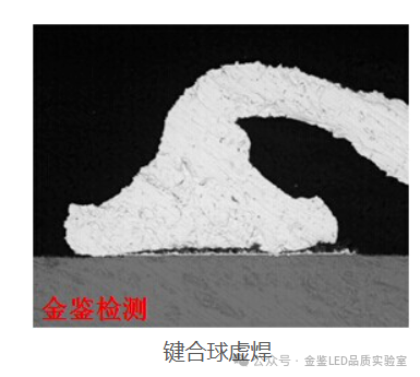 金鉴实验室拥有专业的键合测试设备和技术团队,能够确保测试的准确性和可靠性。键合球直径过大,超出芯片焊盘范围,会压伤芯片发光层,影响电流扩散及出光效率,造成短路、漏电;键合球直径过小,会出现缩线,焊接不上的现象。键合球根部不能有明显的损伤或变细的现象,第二焊点楔形不能出现明显裂纹。键合球无虚焊,挖电极等现象。