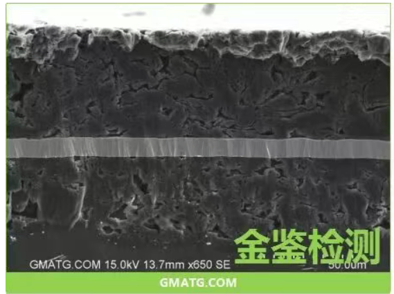 氩离子切割技术主要用于制备宽阔且精确的电子显微分析区域。通过一个坚固的挡板遮挡样品的非目标区域,有效遮蔽离子束的下半部分,从而创造出一个侧切割平面。这种技术能够去除样品表面的一层薄膜,为后续的微观分析提供清晰的界面。其优势在于能够精确控制切割区域,避免对非目标区域的损伤,同时保证切割面的平整度和光滑度,如需专业检测,可联系金鉴检测顾问189-2421-2773。金鉴实验室氩离子抛光制样服务的案例:
