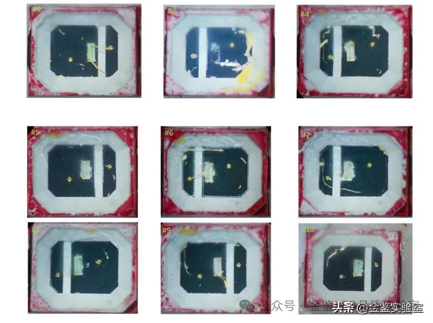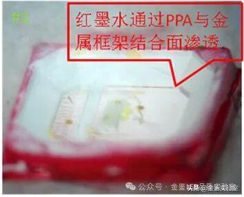 金鉴实验室在LED红墨水试验有丰富的经验及雄厚的实力,为国内众多公司客户提供LED红墨水试验检测服务。在对灯珠光源进行气密性验证时,金鉴实验室红墨水试验可以确认是否存在红墨水渗透现象及其渗透路径。实验样本大小为10pcs,实验1小时后可观察到1pcs光源出现红墨水从PPA与金属框架的结合面渗透入光源内部的现象,这一发现对于改进产品密封设计具有重要意义。