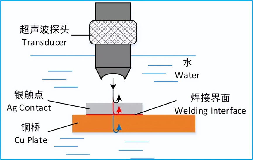 2. 透射模式:T扫描方式,通过将发射和接收换能器分别置于被测器件的上下两侧,检测透射信号。