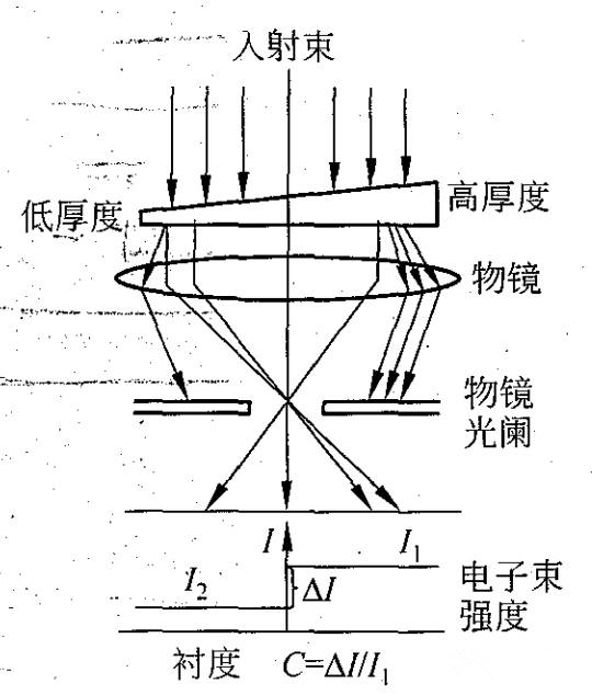 若仅选用透射电子成像的话,则可以想象在无试样处,电子通过量最大,因此观察屏中亮度最大,试样越重,厚度越大,电子越难通过则越暗淡。它叫“明场像”,光路图如图3a。这种因试样厚薄不均匀、质量不一致所造成的明暗差异叫做“质厚衬度”,其原理如图4。在明场模式下,整个视野内比较明亮,比较利于观察样品的大小、尺寸、形貌等信息,图1,2都为明场像。针对材料分析,金鉴实验室提供TEM多种成像模式,涵盖各个环节,满足客户多元化的需求。