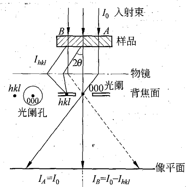 既然有“明场像”,必然就有“暗场像”。所谓“暗场像”是指“收集”散射(衍射)电子成像。因为质量越大、越厚,其散射越强,所以在暗场下其越亮。在没有样品处,因为电子散射很少所以越暗,光路图见如图3b。虽然暗场模式下整个大视野范围内比较暗,但是样品处较亮。特别是满足布拉格衍射的区域会特别亮。这种因衍射强度的差异,所引起的明暗差异叫做“衍射衬度”。在该暗场作用下衍射衬度可用于区分试样不同部位晶粒。