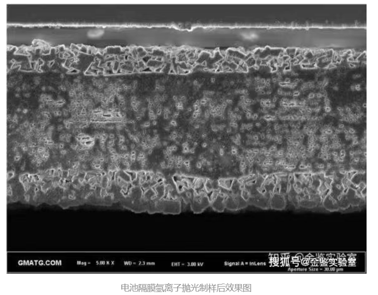 电池隔膜的氩离子抛光效果图显示了隔膜材料的精确结构,对于理解电池内部离子传输机制具有重要意义。图像中隔膜的孔隙结构和表面特性得到了清晰的展示,有助于评估隔膜的性能和耐久性。