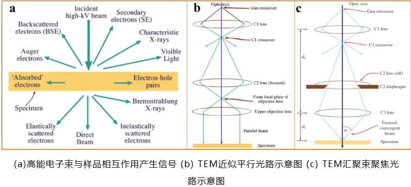 TEM通常采用两种电子束模式:一种是电子束沿与光轴平行的方向传播,类似于手电筒发出的光线;另一种是电子束在光轴上的某一点聚焦,类似于激光器的聚焦效果。这两种模式下的电子束与样品相互作用,产生图像。