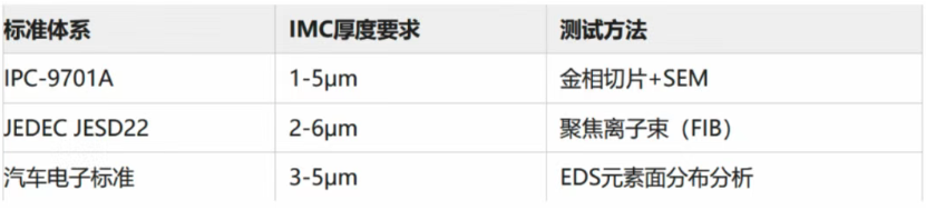 1.行业规范 多个国际标准体系对 IMC 层厚度做出规定,为行业提供统一依据:PC-9701A 标准要求厚度 1-5μm,测试方法为金相切片 + 扫描电子显微镜(SEM);EDEC JESD22 标准要求 2-6μm,测试方法为聚焦离子束(FIB);汽车电子标准直接锁定 3-5μm,测试方法为 EDS 元素面分布分析。金鉴实验室在进行试验时,严格遵循相关标准操作,确保每一个测试环节都精准无误地符合标准要求。