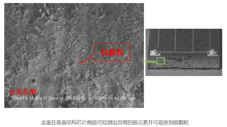 某客户用硅胶封装,导电银胶粘结的垂直倒装光源出现漏电现象,委托金鉴实验室查找原因。金鉴实验室拥有专业的漏电分析测试设备和技术团队,能够确保测试的准确性和可靠性。金鉴通过对不良灯珠分析,在芯片侧面检测出异常银元素,并可观察到银颗粒从底部正极银胶区域以枝晶状延伸形貌逐渐扩散到芯片上部P-N结侧面附近,因此金鉴判定不良灯珠漏电失效极有可能为来自固晶银胶的银离子在芯片侧面发生离子迁移所造成。银离子迁移现象是在产品使用过程中逐渐形成的,随着迁移现象的加重,最终银离子会导通芯片P-N结,造成芯片侧面存在低电阻通路,导致芯片出现漏电流异常,严重情况下甚至造成芯片短路。银迁移的原因是多方面的,但主要原因是银基材料受潮,银胶受潮后,侵入的水分子使银离子化,并在由下到上垂直方向电场作用下沿芯片侧面发生迁移。因此金鉴实验室建议客户慎用硅胶封装、银胶粘结垂直倒装芯片的灯珠,选用金锡共晶的焊接方式将芯片固定在支架上,并加强灯具防水特性检测。