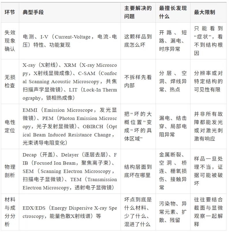 这个顺序看似繁琐,但很重要。因为如果在没有定位的情况下盲目去层、抛光或切截面,就等于在一个已经很小的嫌疑区域里破坏了原始证据。失效分析中最怕的不是找不到故障,而是把本来能找到的证据亲手破坏掉。