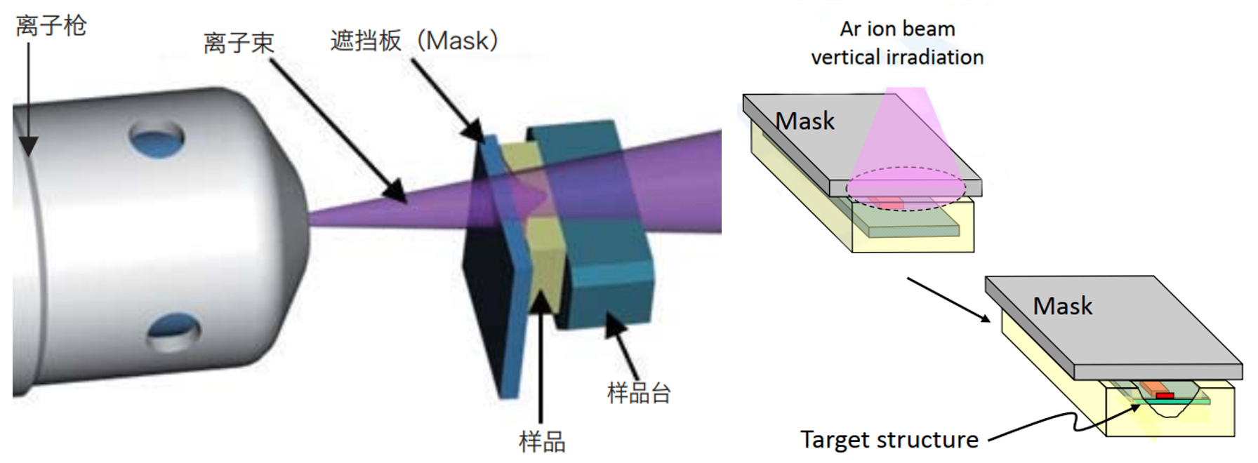 截面抛光加工原理:样品和离子枪之间放置了遮挡板(Mask),样品的上端略突出遮挡板,离子束从遮挡板上方照射到样品上、沿着遮挡板的边缘,加工出平坦的截面。
