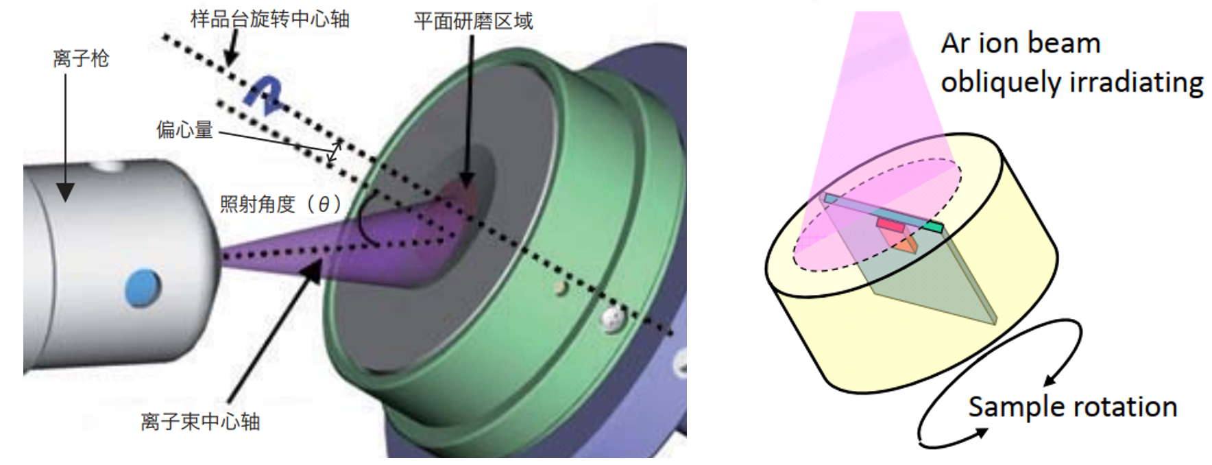 平面抛光加工原理:如果离子束中心轴和样品台旋转中心轴是一致的,则加工出的轮廓反映了离子束流密度分布,即中心部分较深的形状。平面研磨法是利用离子束中心轴和样品台旋转中心轴之间有一定的偏心量,从而获得均一的大范围加工面。