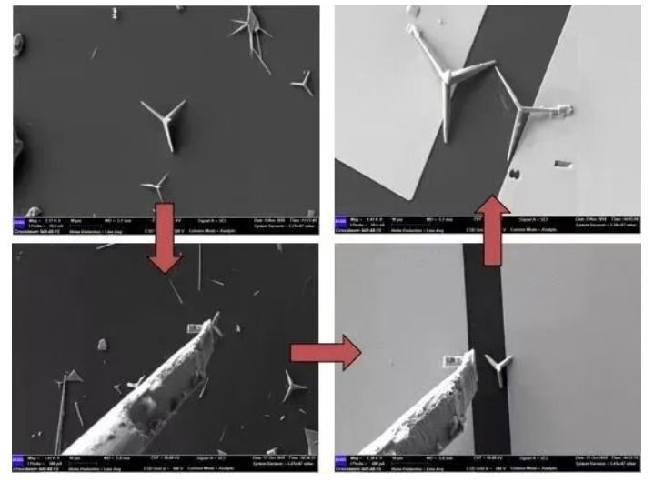 FIB-SEM系统配备的纳米机械手和离子束沉积技术,使得微米级别的材料转移成为可能。通过精确的定位与固定,可将材料从一个衬底转移到另一个指定位置。例如,将氧化锌微米线从硅片转移到两电极沟道间,可制得专用器件。这种材料转移技术在微电子器件的制备与研究中具有重要意义,为微纳器件的创新与开发提供了新的途径。