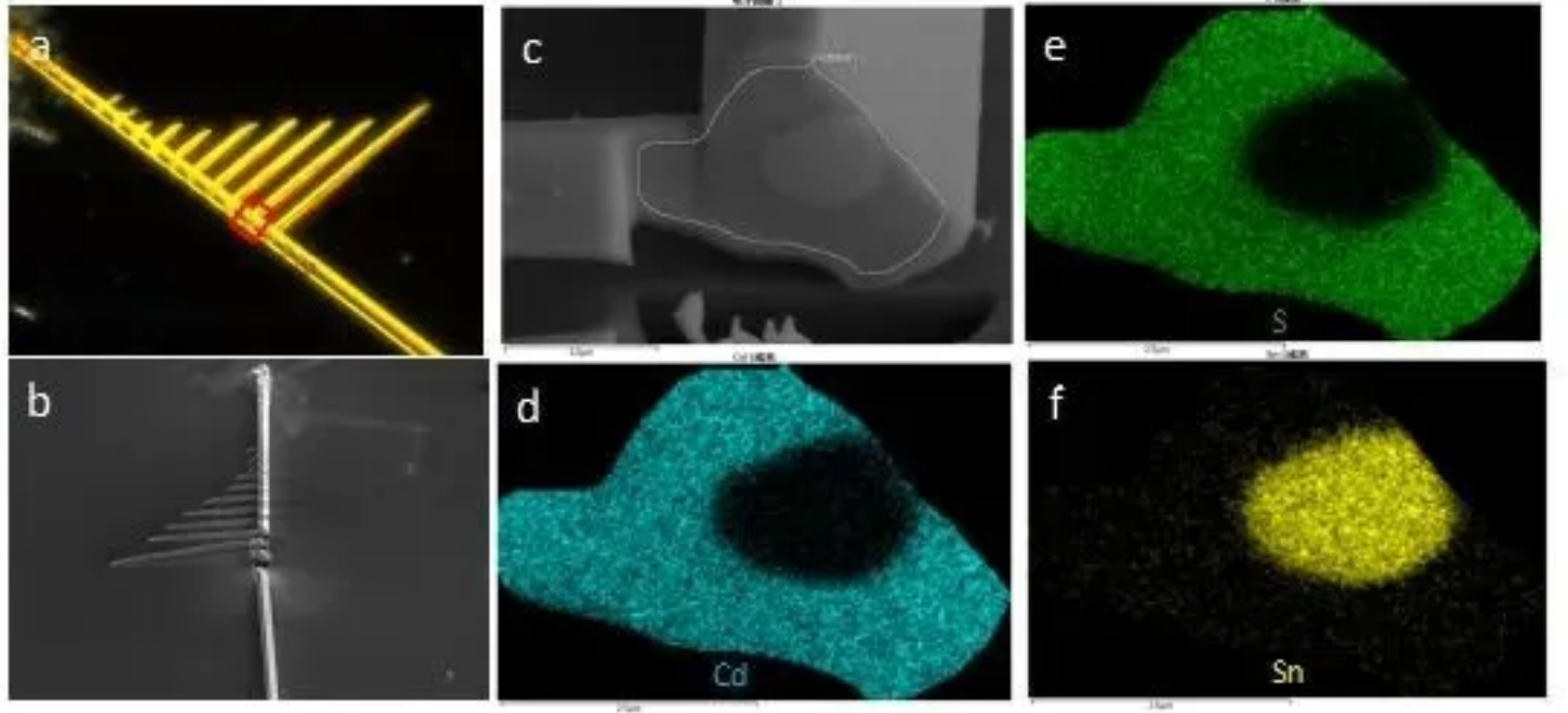 FIB-SEM系统具备精准的定点切割与分析能力,能够深入材料内部,揭示其微观结构与成分。以CdS微米线为例,光学显微镜虽能观察到微米线节点处可能存在其他物质,但无法确定其具体成分与内部形貌。而FIB-SEM技术则可在此节点进行定点切割,制备截面样品,并通过扫描电镜成像与能量色散谱(EDS)mapping,直观呈现内部含有Sn球的结构。这种分析方法为材料微观结构研究开辟了新的视角,使研究人员能够更深入地理解材料的内在特性。