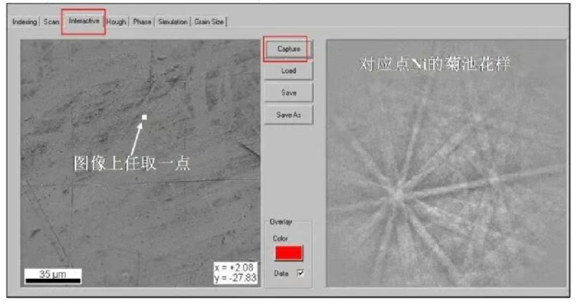 首先采集SEM图像,确定感兴趣的区域,并预览EBSD花样。