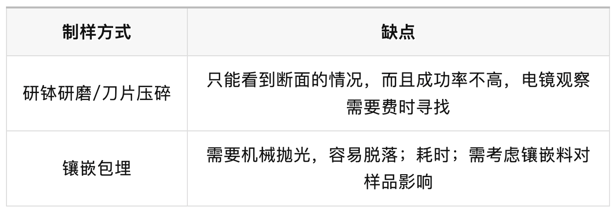 研钵研磨或刀片压碎的方式通常只能暴露颗粒的断裂面,且成功率较低,电镜观察时需要大量时间寻找有效视野;而镶嵌包埋结合机械抛光的方法不仅耗时,还容易导致样品脱落,并且需要考虑镶嵌料对样品的潜在影响。