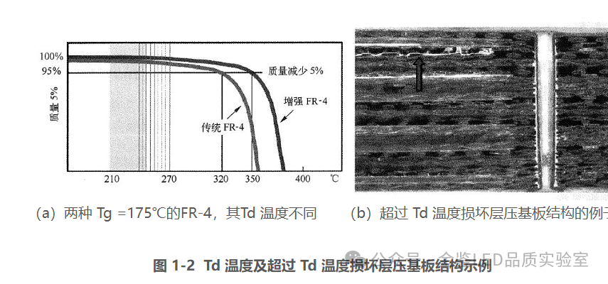 Td 是树脂的物理和化学分解温度。Td 是指当 PCB 加热到其质量减少5% 时的温度。图1-2(a)是两种 Tg 温度都是 175℃ 的 FR-4,但它们的 Td 温度不同。传统的PCB分解温度 Td 为300℃,无铅则要求更高的Td(340℃)。因此,建议无铅 PCB 的 Td 应当是指质量减少2%的温度。当焊接温度超过 Td 时,会由于化学链接的断裂而损坏 PCB 基材,造成不可逆转的降级。图1-2(b)是超过 Td 温度损坏层压基板结构的例子。金鉴实验室拥有专业设备及相关专家团队,可提供Td测试及热稳定性评估,协助筛选适合无铅及高温应用的高性能基材。