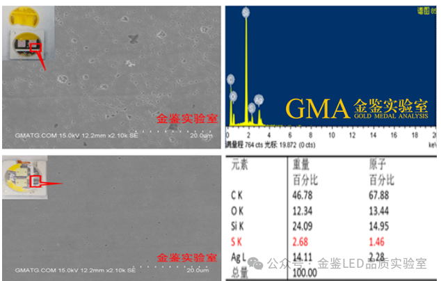 进一步对试验后的A、B灯珠采用机械方法开封后,对镀银层SEM—EDS分析,结果同样显示A款灯珠镀层被硫化腐蚀严重,出现硫化银结晶颗粒和腐蚀空洞;而B款灯珠镀银层表面相对光整,受腐蚀情况较轻微。综上,可得知B款灯珠抗硫化能力明显优于A款灯珠。发生硫化腐蚀后的LED表现为支架功能区发黑,光通量严重下降,色温出现明显漂移,使整个产品的寿命和可靠性大大降低。