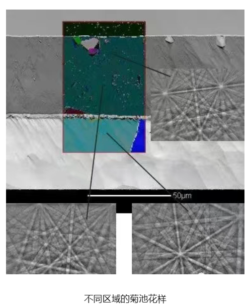 3.结果:经过氩离子抛光技术处理后的多层结构半导体材质样品,每层都能清晰地观察到,焊球的结构清晰可见。菊池花样表明制备出的样品表面质量高,为后续的EBSD分析提供了高质量的数据支持。金鉴实验室在样品制备方面积累了丰富的经验,能够为客户提供专业的样品制备服务,确保样品质量达到最佳状态,从而提高后续测试的准确性。