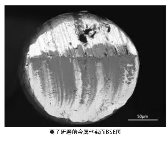 以金属丝样品为例,该样品包含铂(Pt)和镍(Ni)两种成分。在未进行离子研磨前,扫描电镜下的形貌显示,虽然可以分辨出亮度高的Pt元素和亮度低的Ni元素,但两种成分之间并没有明显的界限,且样品表面存在污染物,这可能会影响Pt和Ni的定量分析。