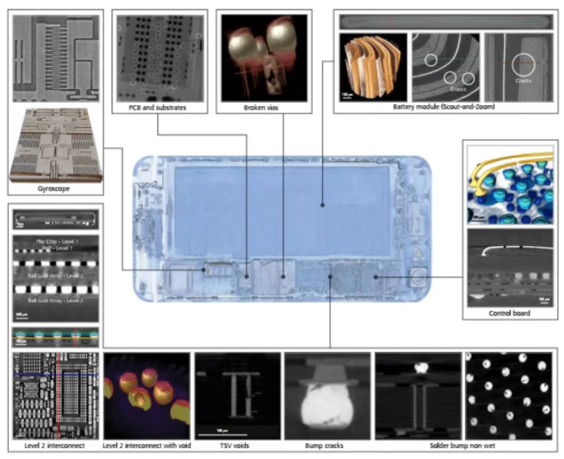现代失效分析有一个核心原则:能不破坏,就先不破坏。因为封装一旦被打开、金属层一旦被去除、介质层一旦被刻蚀,原始的失效状态就可能改变。所以很多分析会先从无损方法入手。金鉴实验室拥有专业的失效分析测试设备和技术团队,能够确保失效分析测试的准确性和可靠性。X射线与三维X射线显微成像是最常见的无损手段。它们适合检查封装级别的问题,例如焊线断裂、焊线偏移、焊点空洞、芯片贴装异常、内部裂纹等。在树脂封装完成之后,细到二三十微米量级的焊线,肉眼无法直接观察,只能依靠高分辨率X射线系统。更先进的三维X射线技术,可以把一系列二维投影重建成三维体数据,实现数字化的“虚拟切片”,在不真正切开器件的情况下查看内部结构。
