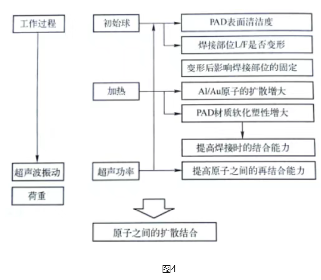 3.热声焊是超声波热压焊接方式 (Thermosonic & Ultrasonic Bonding,U/S&T/S),热声焊原理如图4所示,即在一定压力、超声波和温度共同作用一定时间后,将金球压接在芯片的铝盘焊接表面《金丝球焊)。