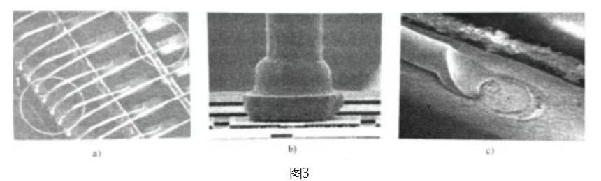 焊线的目的是将晶粒上的接点以极细的金线(18~50μm)连接到引线架上的内引脚。从而将集成电路晶粒的电路信号传输到外界。当引线架从弹匣内传送至定位后,应用电子影像处理技术来确定晶粒上各个接点以及每一接点所对应的内引脚上接点的位置,然后完成焊线的动作,焊线示意图如图三所示。焊线时,以晶粒上的接点为第一焊点,内引脚上的接点为第二焊点,焊线焊点如(图3a)所示。首先将金线的端点烧结成小球,而后将小球压焊在第一焊点上(此称为第一焊,First Bond), 如(图3b) 所示。接着依照设计好的路径拉金线,最后将金线压焊在第二焊点上(此称为第二焊,Second Bond),如(图3c)所示。同时拉断第二焊点与钢嘴间的金线,完成一条金线线的焊线动作。接着便又结成小球开始下一条金线的焊线动作。