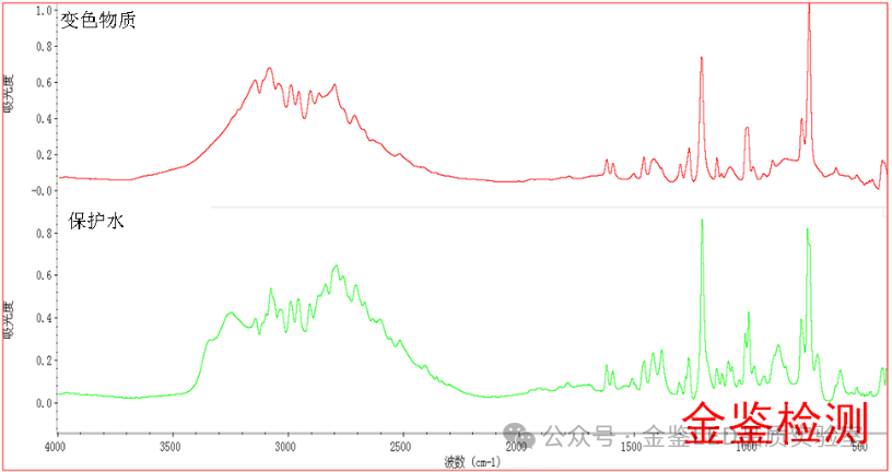 金鉴通过对变色质与保护水红外光谱谱图对比,变色物质和保护水谱图相似,在波数3250cm-1变色物质没有吸收峰是由于苯并三氮唑的N=N基团被氧化。