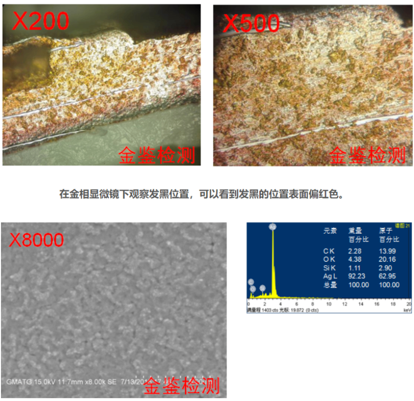 在金相显微镜下观察发黑位置,可以看到发黑的位置表面偏红色。在扫描电镜下观察发黑区域镀银层表面形貌,其表面较粗糙,正常的镀银层在8000倍率下是不能观察到其晶格形貌,所以此形貌为异常现象。