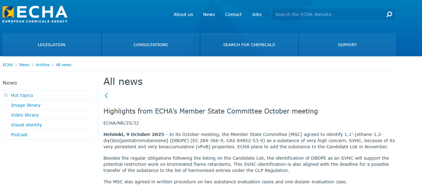 2. 1,1’-(1,2 - 亚乙基) 双 [五溴苯](DBDPE)被认定为 SVHC 候选物质与十二甲基五硅氧烷 “撤出” 形成对比的是,ECHA 于 2025 年 10 月 9 日(MSC 第 91 届会议后)发布消息,同意将 DBDPE(EC 284-366-9,CAS No.:84852-53-9)认定为 SVHC 候选物质,计划 11 月正式纳入候选清单。从认定依据看,DBDPE 因被证实具备 vPvB 特性入选:高持久性使其在环境中难降解、长期留存;高生物累积性使其易通过食物链富集,威胁生态与人类健康。从应用场景看,DBDPE 作为替代十溴联苯醚的主流阻燃剂,广泛用于聚苯乙烯、ABS 树脂、汽车电线电缆、电子连接器、建筑泡沫塑料、纺织背涂层等,涉及电子电器、汽车、建筑、纺织多行业。ECHA 强调,此次认定是推进溴化阻燃剂淘汰的重要一步,未来可能基于风险评估出台更严格限制措施(如使用禁令)。因此,涉及 DBDPE 生产、进口、销售或使用的企业需高度重视,提前合规准备,避免产品无法进入欧盟市场。金鉴实验室拥有专业的 DBDPE检测设备和技术团队,能够为企业提供专业的检测服务,确保这些物质在使用中的安全性和合规性。