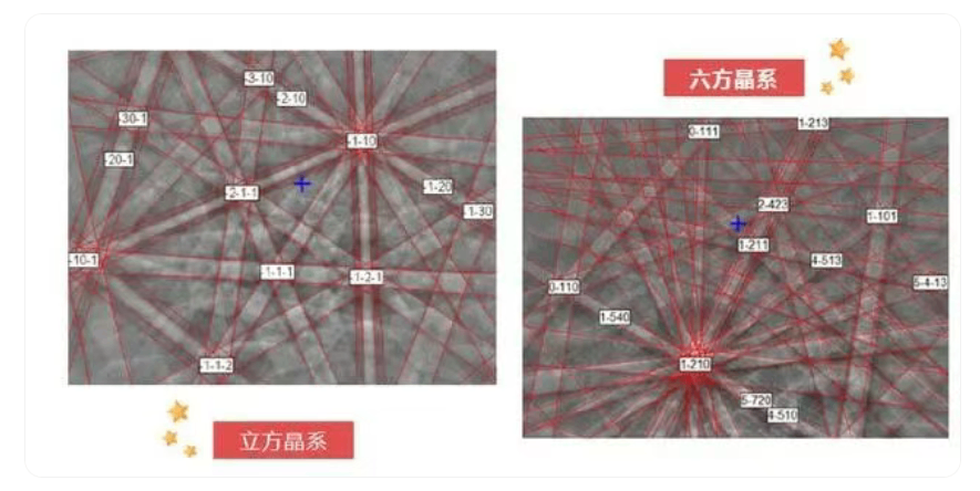 当电子束入射到样品表面时,与样品中的晶体结构相互作用,产生背散射电子。这些电子在荧光屏上形成特定的衍射图案,即菊池花样。菊池花样中包含了晶体的晶系对称性信息,晶面和晶带轴之间的夹角与晶体的晶系类型和晶格参数相对应。通过分析这些衍射花样,可以获得晶体的晶体学取向。
