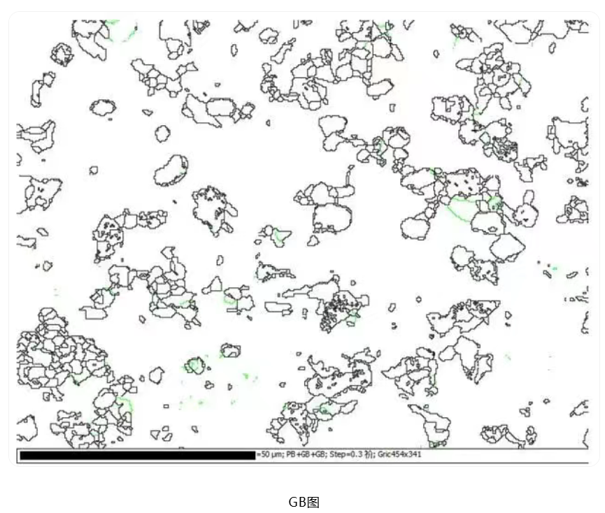 3. 晶界分析:通过GB图和晶粒尺寸统计柱状图,分析晶粒边界和晶粒尺寸。