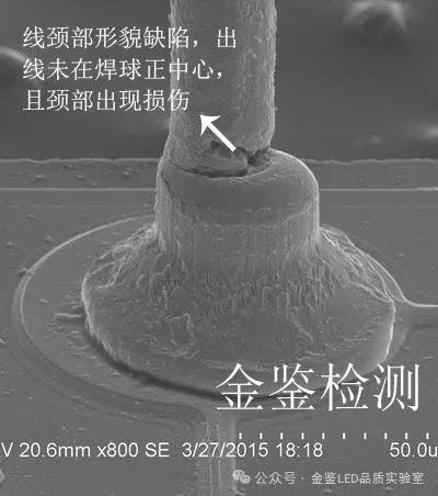瓷嘴选择是否合适,对于植球后球形貌、键合质量等有着重要影响。金线之线径与瓷嘴之孔径未恰当匹配,会造成植球后线颈部损伤或缺陷,并对该处接强度造成恶劣影响,在冷热冲击的测试或使用环境下,导致B点疲劳失效,并最终导致电气连接回路出现虚接触甚至开路,造成灯珠闪烁或死灯不良。