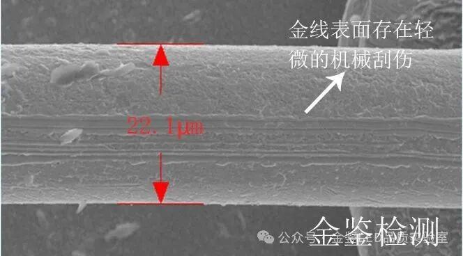 金鉴实验室通过大量的失效案例发现,瓷嘴磨损严重后,内倒角结构被破坏,还会造成金线表面机械刮伤,严重时将对引线连接可靠性造成威胁:金线被刮伤后,引线损伤部位截面积变小、电流密度加大,使损伤部位易被烧毁熔断;同时,金线被刮伤后,还会造成损伤处抗机械应力的能力降低,极易造成引线损伤处断裂失效。另外,瓷嘴磨损严重后也会对线弧成型造成影响。