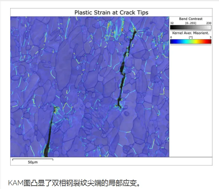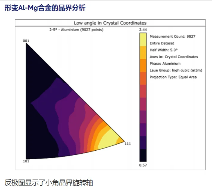 3. 晶粒特征:EBSD取向面分布图提供了晶体学取向的空间分辨信息,从中可以推导出严格的晶粒尺寸和形状。这些信息包括晶粒大小、晶粒形状/形貌、晶粒平均取向、晶粒内部取向变化和孪晶比例。
