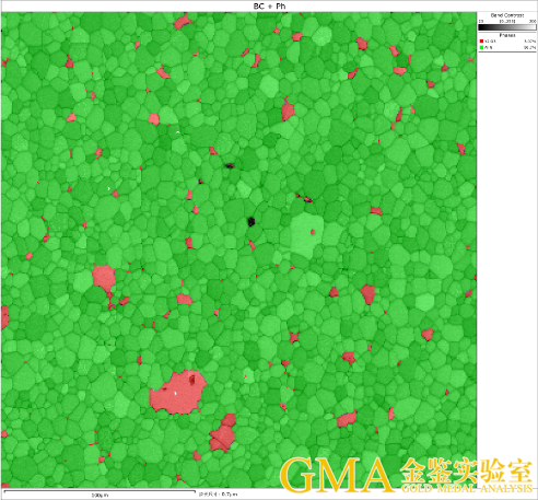 1. 相分布:EBSD经常用于绘制样品中相的分布并测量相的面积分数。典型的输出是相分布图,以及各个相对应的面积百分比。