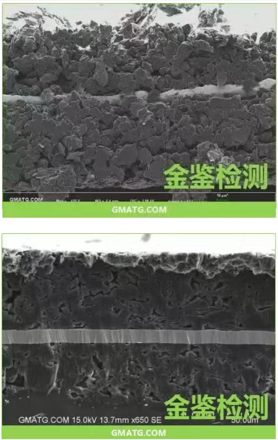 而经过金鉴实验室氩离子抛光后,损伤层被完全去除,内部结构清晰可见,孔隙度也能够准确测量,从而为材料的吸液性和寿命分析提供了可靠依据。