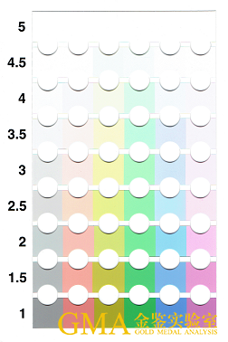 (2)九色卡目检: 如下方图片为九色卡,用以测试TPU耐候测试前后光学特性,允许通过两项测试后,黄化程度在4.5-5之间为 “通过”;若为4-4.5则为“特收品”,非必要不用;若小于4,则为 "不通过"。