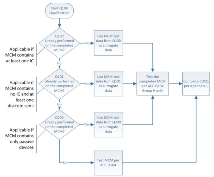 在AEC-Q104中,MCM上使用的所有组件,包括电阻、电容、电感等被动组件、二极管离散组件及IC本身,若在组合前已通过AEC-Q100、AEC-Q101或AEC-Q200认证,则MCM产品只需进行AEC-Q104H中的7项测试。这些测试包括: