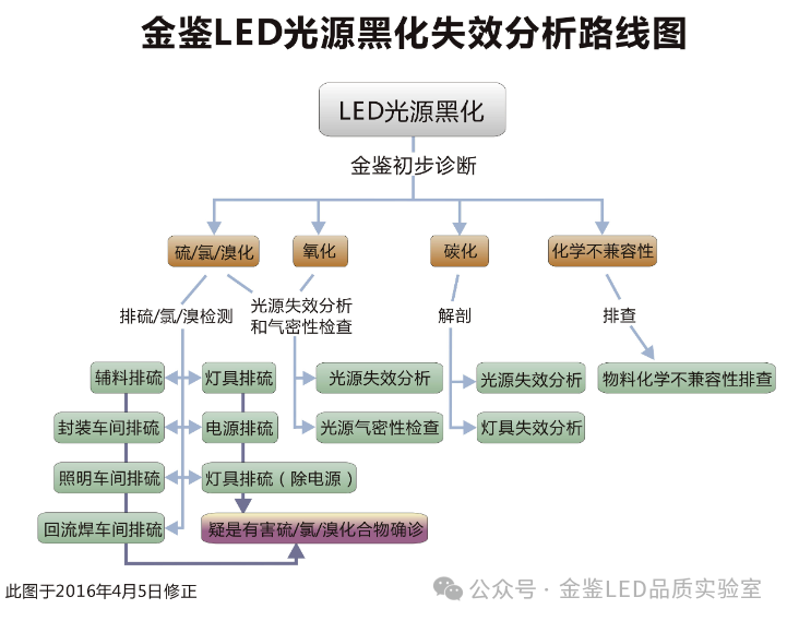由上面这个实验得知,水和氧气在镀银层发黑硫化起关键作用。因此灯珠一定要做好气密性检测。基于以上分析,我们把LED光源黑化失效分析路线图修正为: