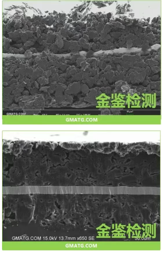 与传统的金相研磨抛光相比,氩离子抛光技术能够更有效地去除表面损伤层,提供更清晰的截面图像。这对于锂电池材料的研发和质量控制具有重要意义,能够帮助研究人员更好地理解微观结构与性能之间的关系,为开发高性能锂电池提供技术支持。下图是抛光前后对比图: