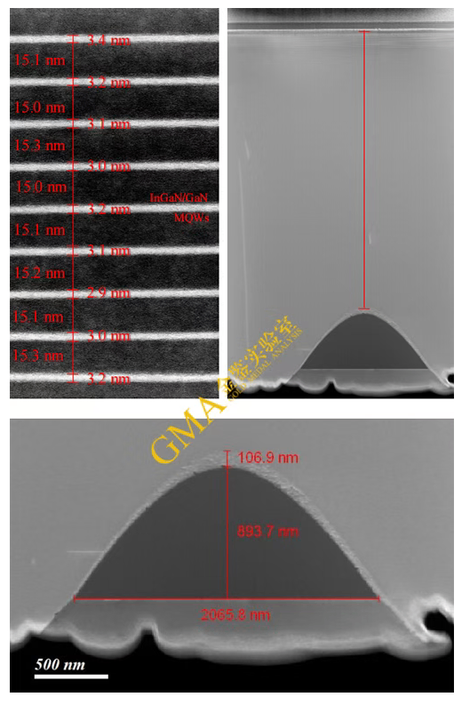 透射电子显微镜TEM在LED芯片研究中可以提供有关LED芯片结构、膜层厚度、位错缺陷等方面的详细信息。金鉴实验室作为专注于材料分析领域的科研检测机构,具备先进的TEM设备和专业的技术团队,能够为客户提供高精度的LED芯片分析服务,确保每一项测试结果的准确性和可靠性。不同类型的芯片结构在工艺设计上有所不同,金属电极与外延各层成分分析与厚度测量常常需要通过TEM分析才能获得更加精确的信息。