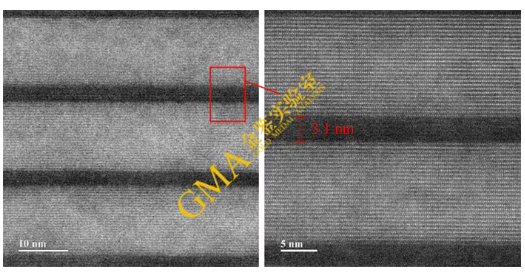 TEM有多种成像模式,可以通过不同的成像模式获取样品的不同信息,金鉴实验室利用高分辨电子显微像HRTEM,能够表征材料原子级别的形貌及结构信息,对量子阱结构厚度进行精确测量,帮助客户在技术研发中把握关键参数。
