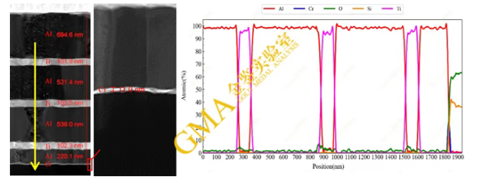 TEM线扫提供沿着一条线的元素分布信息,得到线上不同位置的元素种类和相对含量(at%和wt%),提供详细的产品结构信息,为后续工艺优化或产品结构设计提供参照。