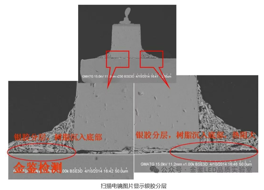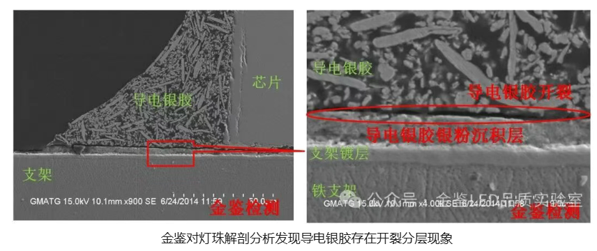 金鉴对灯珠解剖分析发现导电银胶存在分层现象,部分银粉沉入到底部,形成致密的一层。银微粒含量过高,被连结树脂所裹覆的几率低,固化成膜后银导体的粘接力下降,出现开裂现象,电性不再提高,电阻值增大,进一步影响芯片散热,如此恶性循环后,最终导致固晶层与支架之间完全剥离,导电通路被断开,并造成灯珠死灯失效。我们建议客户加强银胶的来料检验,规范银胶的使用工艺。