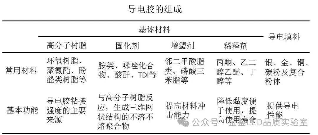 附:导电胶通过向基体树脂中加入具有导电性的粒子,从而使其具有导电性及粘接性。因此,导电胶一般由高分子树脂、稀释剂、固化剂、促进剂、导电填料以及其它的添加剂等组成。如表所示。