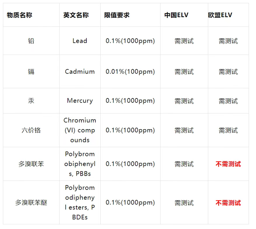 在测试项目上,欧盟ELV主要测试四项物质(Hg、Cd、Pb、Cr(VI)),而中国ELV测试六项物质(Hg、Cd、Pb、Cr(VI)、PBB、PBDE),RoHS则测试十项物质(Hg、Cd、Pb、Cr(VI)、PBB、PBDE、DEHP、DBP、BBP、DIBP)。