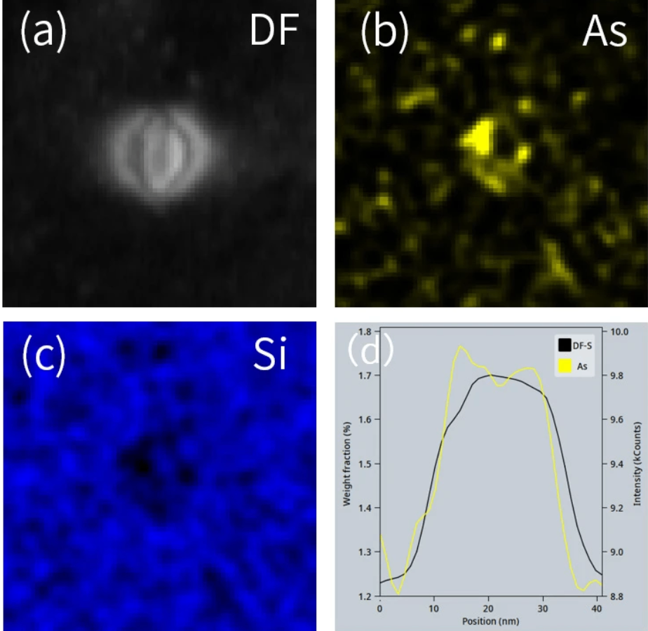 图2(a)为缺陷区域的STEM暗场像,显示出晶格应变衬度; 图2(b)中EDS谱图明确指示缺陷处存在As元素富集,正常区域则分布均匀; 图2(c)显示缺陷区域硅含量低于周边基体; 图2(d)为线扫描分析,清晰反映出As富集位置与暗场衬度之间的相关性。