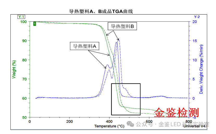 对导热塑料A/B成品TGA曲线对比分析显示两者TGA曲线形状和变化趋势不一致。表现为:①曲线不重合,说明失重速率不同。②降解变化数量不同。导热塑料A为三阶降解,导热塑料B为四阶降解。