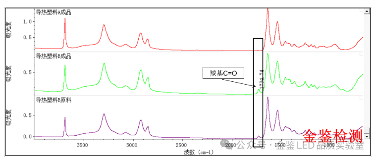 金鉴对导热塑料A和B红外光谱对比分析,结果显示均为聚酰胺类物质,即PA,但两者在1735cm-1附近的羰基C=O特征吸收峰强度存在明显差异,故推断两者材料存在一定程度的差异,红外测试结果为不一致。