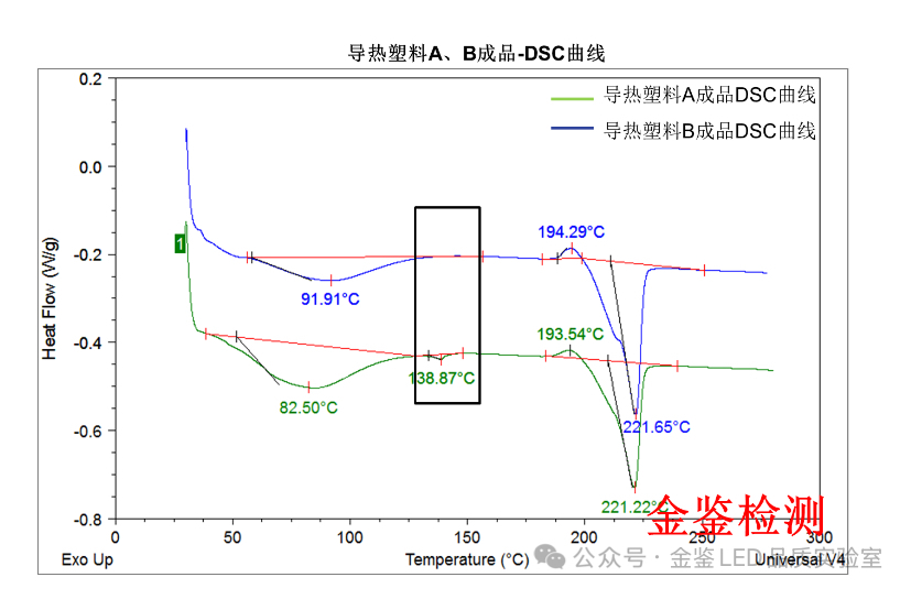 对导热塑料A/B成品DSC曲线对比分析显示两者DSC曲线不一致。主要差异为导热塑料A成品DSC曲线在约139℃左右出现异常吸热峰,而导热塑料B成品DSC曲线未见异常吸放热现象。