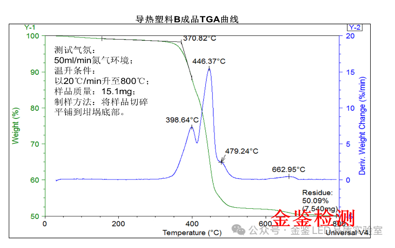 导热塑料B成品TGA曲线显示,样品为四阶降解,各阶段降解峰温分别为398.64℃、446.37℃、479.24℃和662.95℃;外推起始温度为370.82℃;800℃时样品残余量为50.09%。