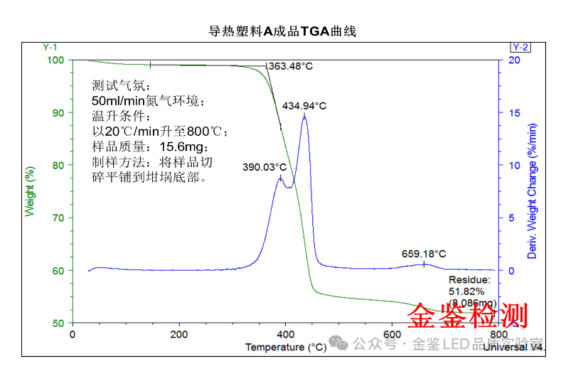 导热塑料A成品TGA曲线显示,样品为三阶降解,各阶段降解峰温分别为390.03℃、434.94℃和659.18℃;外推起始温度为334.63℃;800℃时样品残余量为51.82%。
